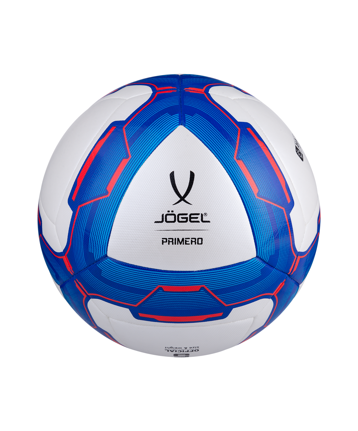 Уникальной особенностью модели Primero является конструкция мяча, состоящая из 20 панелей, восемь из которых выполнены в форме треугольника. Привлекательный дизайн коллекции ярко выделяет мячи JOGEL на витрине. Данный мяч подходит для поставок на государственные тендеры. Официальный размер и вес FIFA.