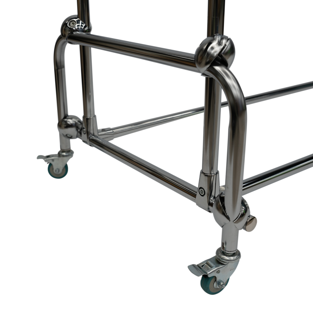 Стеллаж изготовлен из хромированной стали, снабжен транспортировочными колесами для удобства перемещения. Конструкция очень устойчива, отсутствие острых углов минимизирует возможность получения травмы. Поставляется в частично-разобранном виде с паспортом изделия.