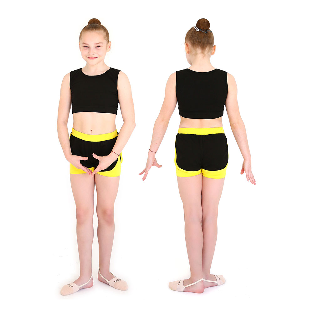 Шорты двойные гимнастические Indigo SM-346-32, р.32, хлопок, эластан, черно-желтый