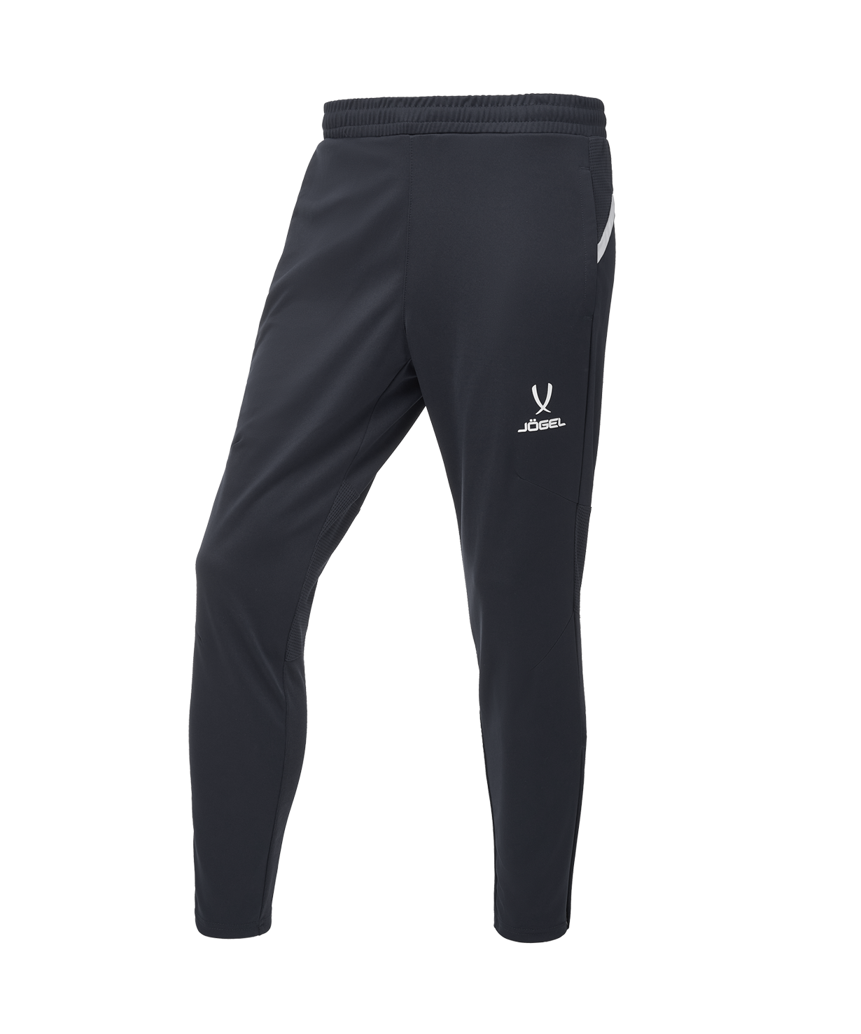 Pro Training Pants – спортивные брюки для динамичных тренировок. Модель оптимальна как для профессионалов, так и любителей: продуманный крой с оригинальным дизайнерским решением обеспечит максимальный комфорт. Спортивные штаны имеют атлетичный силуэт с зауженными книзу брючинами и боковыми молниями на щиколотках, позволяющими снимать и надевать изделие прямо поверх бутс! Сочетание трех видов высокотехнологичной ткани учитывает все потребности спортсмена. Сетчатые вставки, расположенные на фигурной кокетке сзади и на задней поверхности колена, обеспечивают качественное воздухоотведение в местах, требующих дополнительной вентиляции. Идеальное прилегание достигается использованием рубчатой ткани на задней поверхности брюк, что позволяет спортивным штанам точно подстраиваться под движения тела, а для оптимальной посадки спереди на колене проработано решение в виде вытачек. Основная ткань имеет специальное двойное переплетение нитей (Double Weave). Эластичный пояс надежно фиксирует изделие на бедрах при помощи завязок-шнурков. Боковые карманы застегиваются на молнию, а с левой стороны размещена контрастная вышивка JOGEL. Модель создает идеальный комплект с тренировочным джемпером JOGEL DIVISION PerFormDRY Pro Training Top.