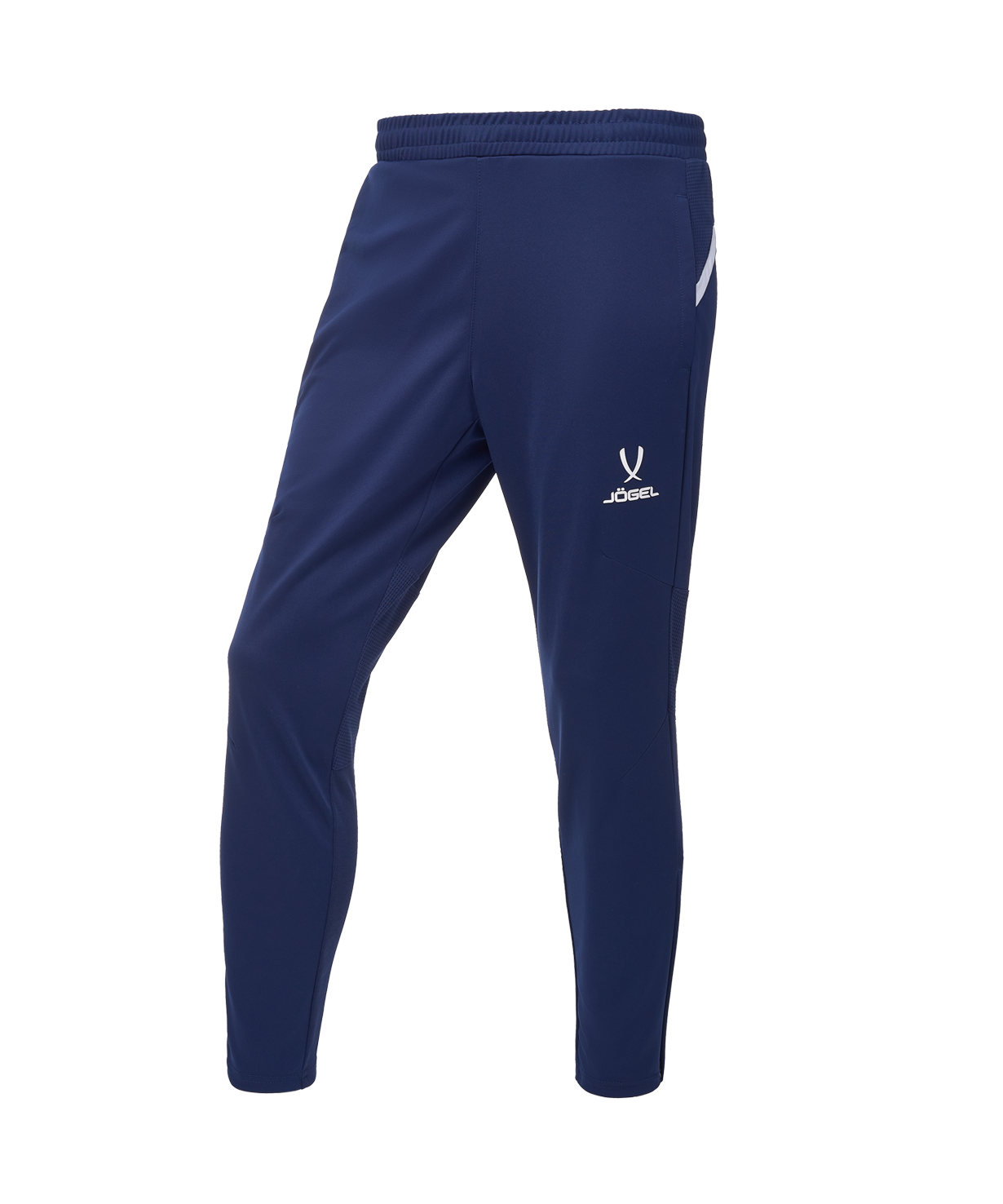 Pro Training Pants – спортивные брюки для динамичных тренировок. Модель оптимальна как для профессионалов, так и любителей: продуманный крой с оригинальным дизайнерским решением обеспечит максимальный комфорт. Спортивные штаны имеют атлетичный силуэт с зауженными книзу брючинами и боковыми молниями на щиколотках, позволяющими снимать и надевать изделие прямо поверх бутс! Сочетание трех видов высокотехнологичной ткани учитывает все потребности спортсмена. Сетчатые вставки, расположенные на фигурной кокетке сзади и на задней поверхности колена, обеспечивают качественное воздухоотведение в местах, требующих дополнительной вентиляции. Идеальное прилегание достигается использованием рубчатой ткани на задней поверхности брюк, что позволяет спортивным штанам точно подстраиваться под движения тела, а для оптимальной посадки спереди на колене проработано решение в виде вытачек. Основная ткань имеет специальное двойное переплетение нитей (Double Weave). Эластичный пояс надежно фиксирует изделие на бедрах при помощи завязок–шнурков. Боковые карманы застегиваются на молнию, а с левой стороны размещена контрастная вышивка JOGEL. Модель создает идеальный комплект с тренировочным джемпером JOGEL DIVISION PerFormDRY Pro Training Top.