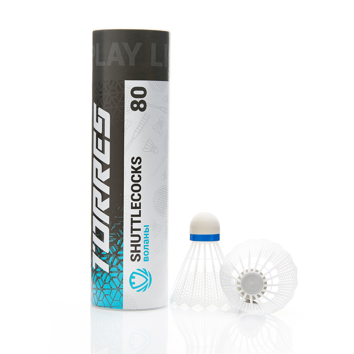 Волан TORRES 80, любительского уровня для игры в зале и на улице. Пластиковая (ПВХ) юбка белого цвета. Пластиковая (ПВХ) "головка" волана, с индикаторной лентой синего цвета, что соответствует средней скорости, для игры при температуре от 12 до 23 °С.