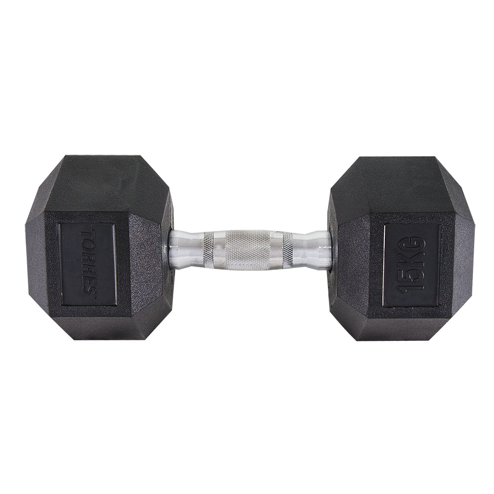 Гантель TORRES 15 кг, PL51915, металл в резиновой оболочке, форма шестигранник, черный