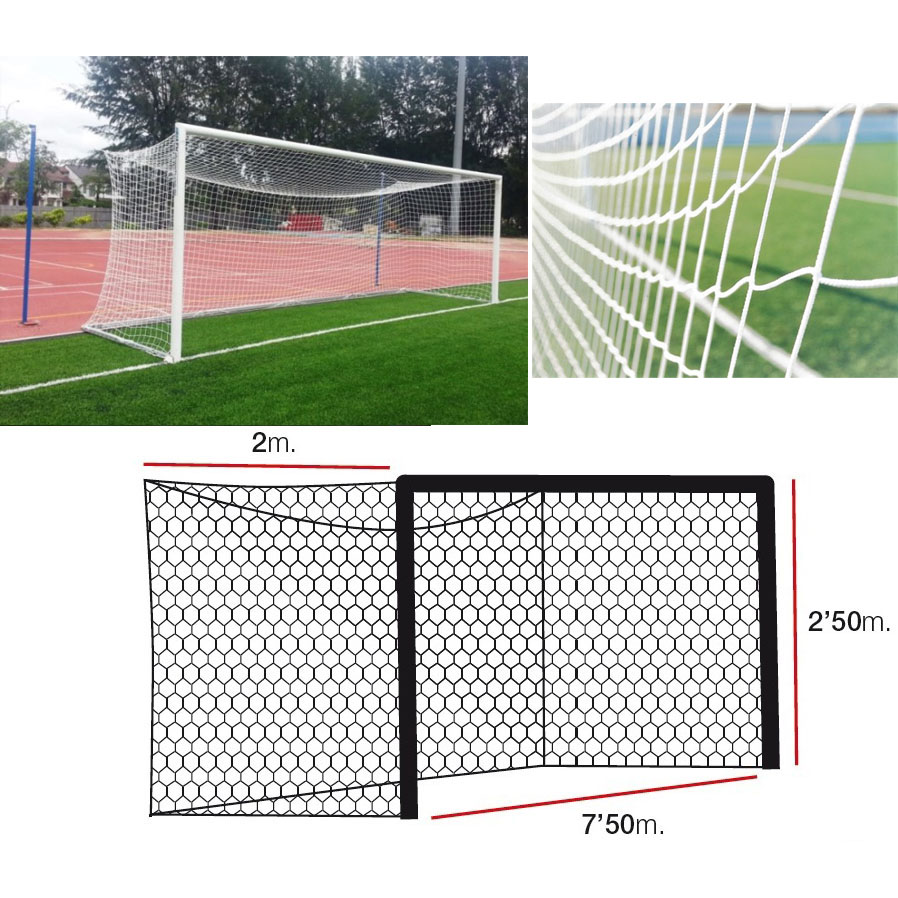 Произведена по безузловой технологии, ячейка - четырехугольная стандартного размера 10х10 см. Нить 4,0 мм светостабилизированный (защита от ультрафиолета) и стойкий к агрессивным атмосферным воздействиям полипропилен. Под размер ворот: а: 7.50 м (длина), b: 2.50 м (высота), c: 2.00 м (глубина ворот по верху), d: 2.00 м (глубина ворот по низу). Цвет белый.