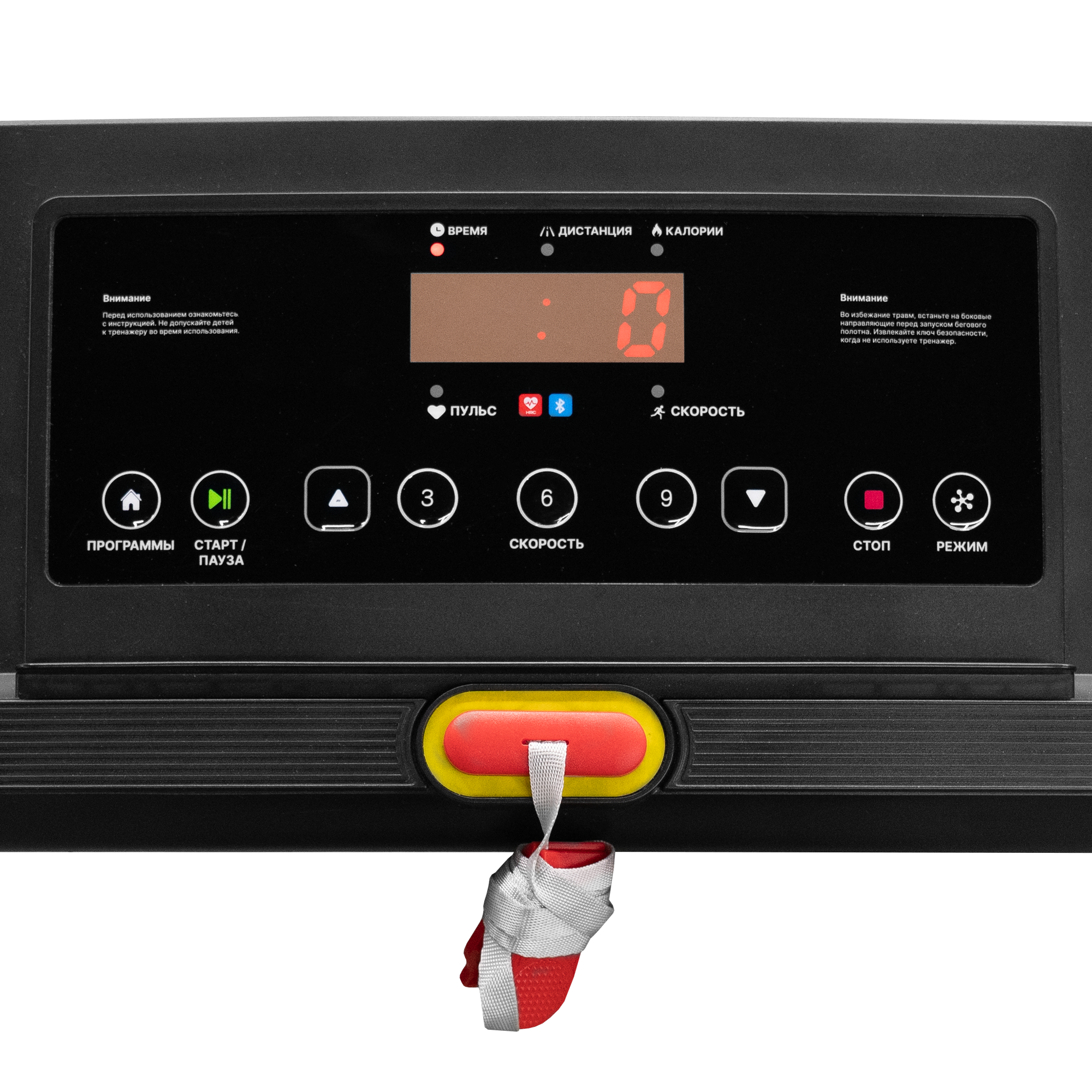 LED-дисплей консоли с понятным интерфейсом на английском языке отображает основные параметры тренировки: время, скорость, дистанцию, количество потраченных калорий и пульс. Встроенные сенсорные датчики позволяют отслеживать пульс прямо во время занятий. Для удобства пользователя дорожка оборудована Bluetooth-колонкой для прослушивания музыки с телефона и подставкой для смартфона или планшета.