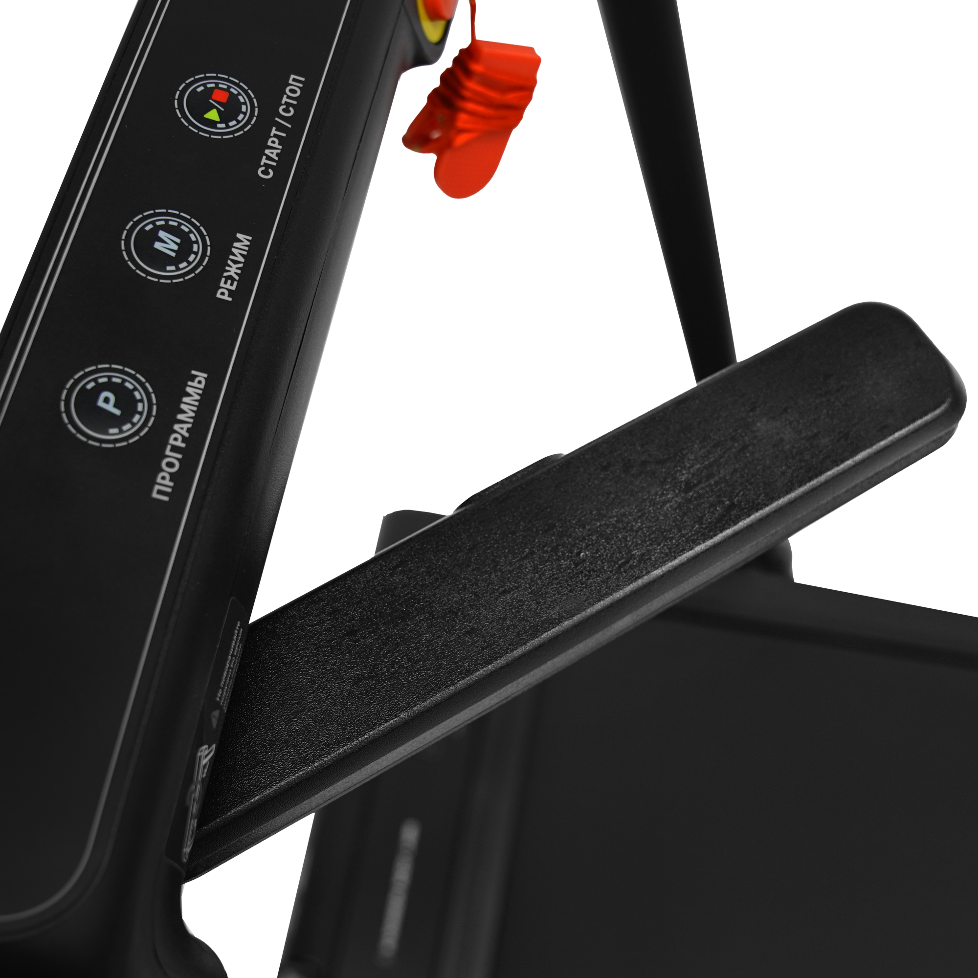 Тренажер оснащен LED-консолью с русским и английским интерфейсом, которая отображает все ключевые параметры тренировки: время, скорость, дистанцию, калории, уровень наклона и текущую программу. В распоряжении пользователя 16 программ, включая 12 встроенных и 3 целевых. Дополнительно предусмотрен ручной режим для индивидуальной настройки. Съемная парта и пульт-браслет для дистанционного управления обеспечивают максимальный комфорт во время тренировки.