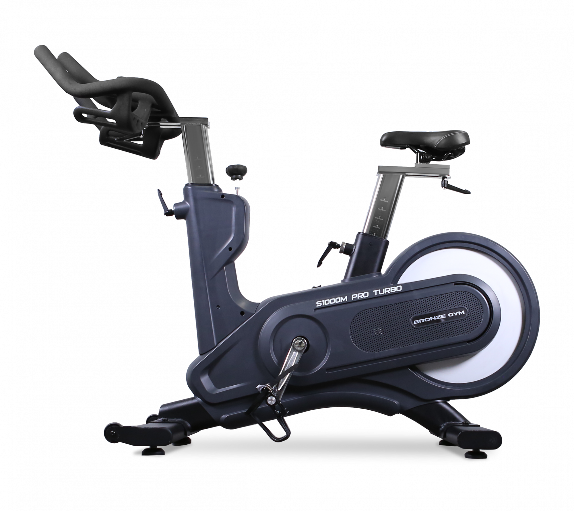 BRONZE GYM S1000M PRO TURBO - профессиональный спин-байк для клубных тренировок в режиме максимальных нагрузок (full commercial). Все узлы и детали проверены многолетним опытом эксплуатации в различных условиях по всему миру. Безусловно, надежность - одна из важнейших характеристик любого оборудования, но отличается BRONZE GYM S1000M PRO TURBO не только этим. В первую очередь, стоит выделить его великолепную биомеханику. В основе находится ременной привод с преднатяжителем и магнитной системой нагружения. Последняя является самой прогрессивной разработкой в биомеханике спин-байков и обеспечивает самую высокую степень эффективности и комфорта. Усиливает великолепный биомеханический эффект маховик с инерционным весом 20 кг, выполненный по уникальной технологии с использованием алюминиевого обода. Его отличие - абсолютно ровный диаметр и равномерное распределение веса (плотности) по своей форме. Это еще один плюс в копилку ровного плавного хода и самого высокого коэффициента инерции. BRONZE GYM S1000M PRO TURBO отлично проходит так называемый "Тест на 6 часов" (проверка равномерности распределения нагрузки при педалировании, проводится в положении стоя; как правило, большинство спин-байков "проваливаются" (скорость увеличивается, нагрузка падает) при движении шатуна из верхнего положения в нижнее).