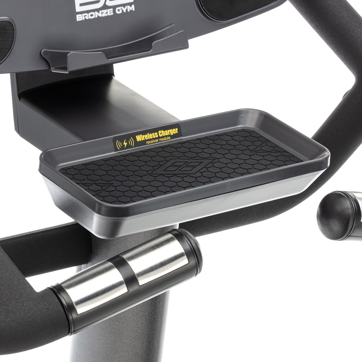 Беспроводная зарядка для мобильных устройств позволяет заряжать ваш смартфон или планшет прямо во время тренировки, обеспечивая непрерывность ваших занятий. Подставка под бутылку и транспортировочные ролики с компенсаторами неровностей пола добавляют дополнительные удобства и делают использование тренажера максимально комфортным.