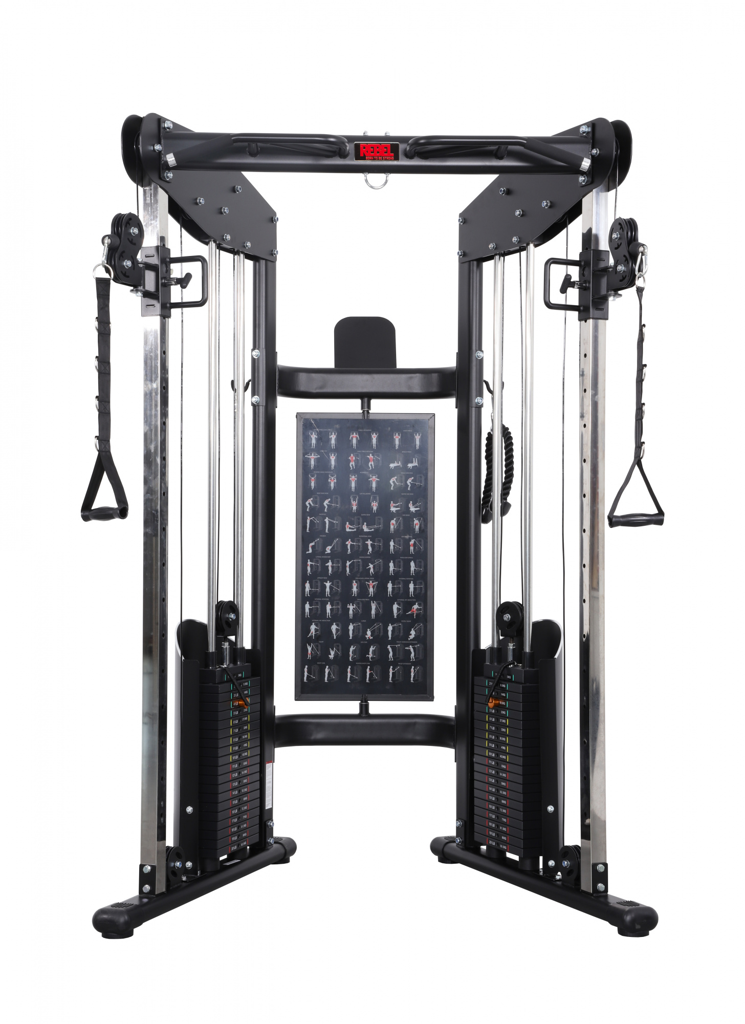 Угловой кроссовер с двумя независимыми весовыми стеками по 90 кг REBEL RCCB37-90 позволит вам выполнять неограниченное количество упражнений на все группы мышц. А удобная вращающаяся схема упражнений поможет вам в этом.