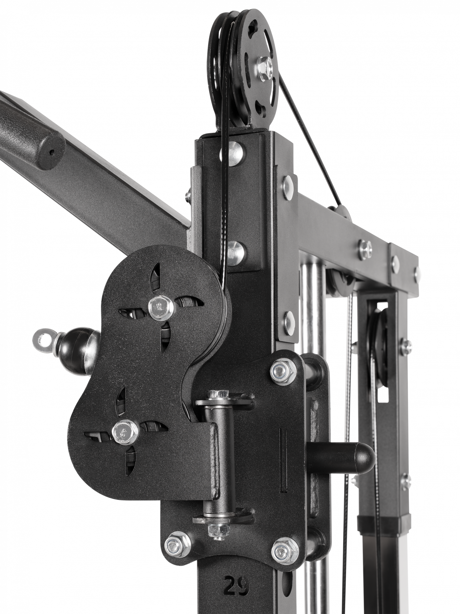 В конструкции предусмотрены различные точки опоры: подставка для ног для горизонтальной тяги, упор для отжиманий, а также регулируемые валики для ног Ø80 мм (6 уровней настройки).