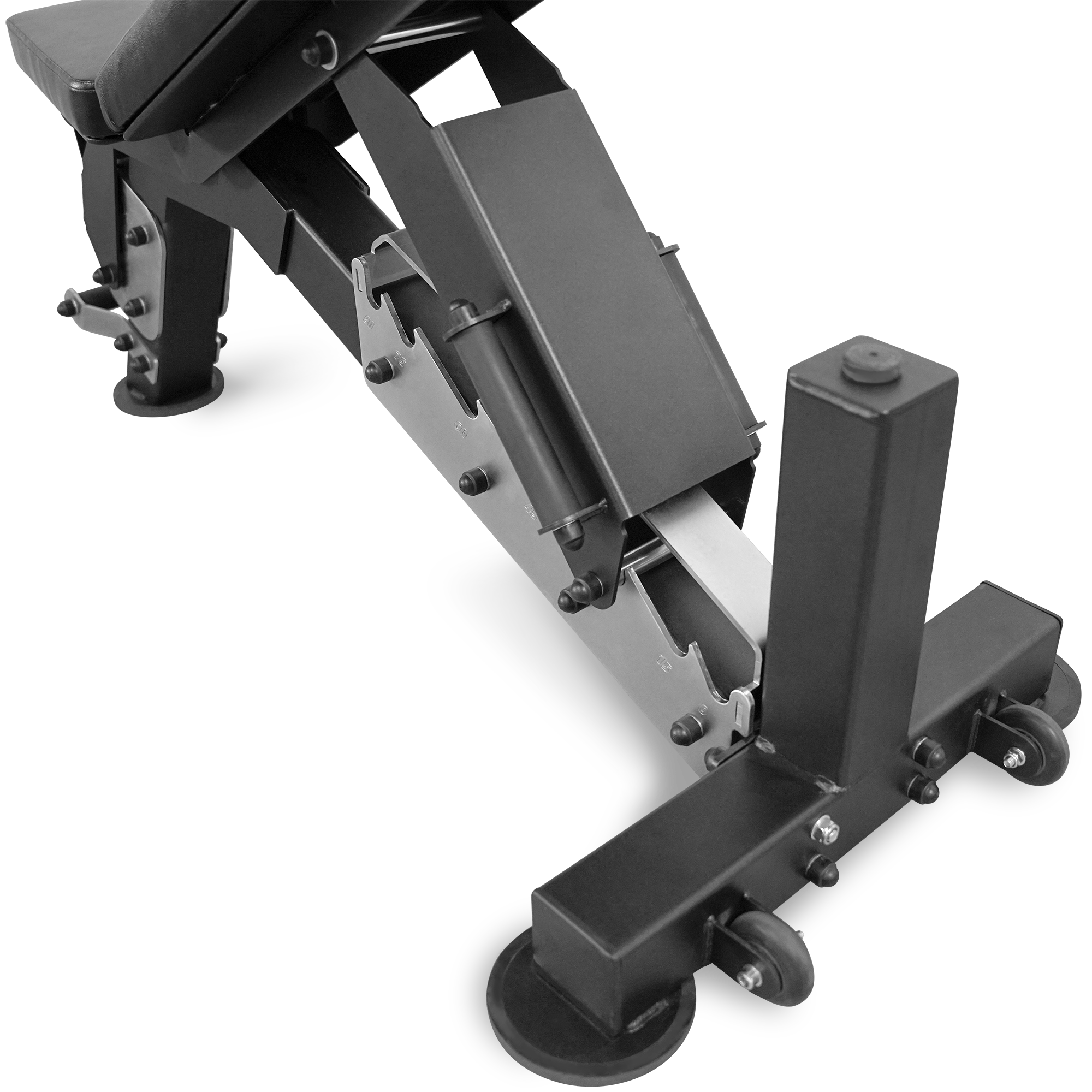 А благодаря большим прорезиненным опорам и удобным транспортировочным колёсам, скамья легко перемещается и уверенно стоит на любой поверхности.